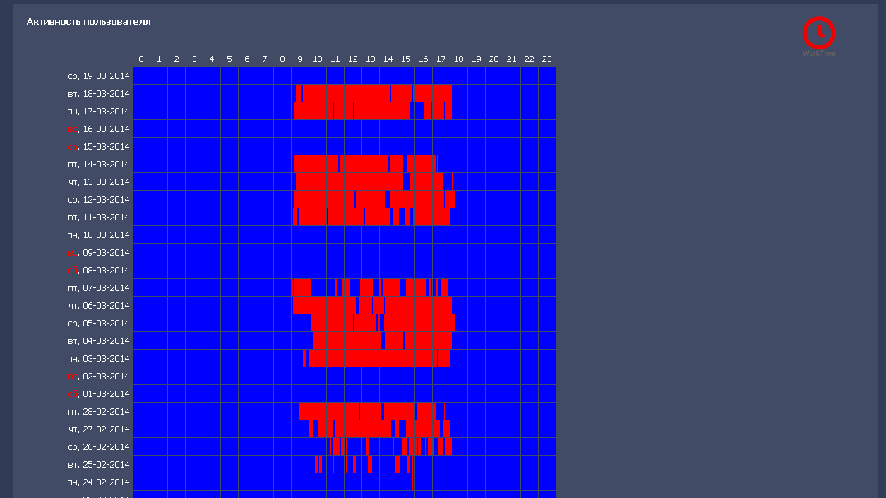 По графику активности пользователя можно увидеть на сколько тот или иной сотрудник усердно работает, и как часто отвлекается. Кроме того, визуально видно, во сколько начинается и заканчивается рабочий день.