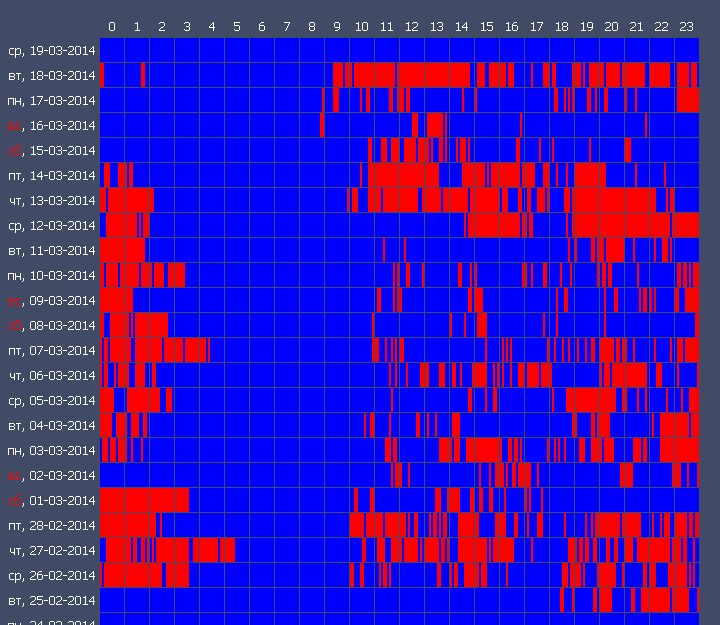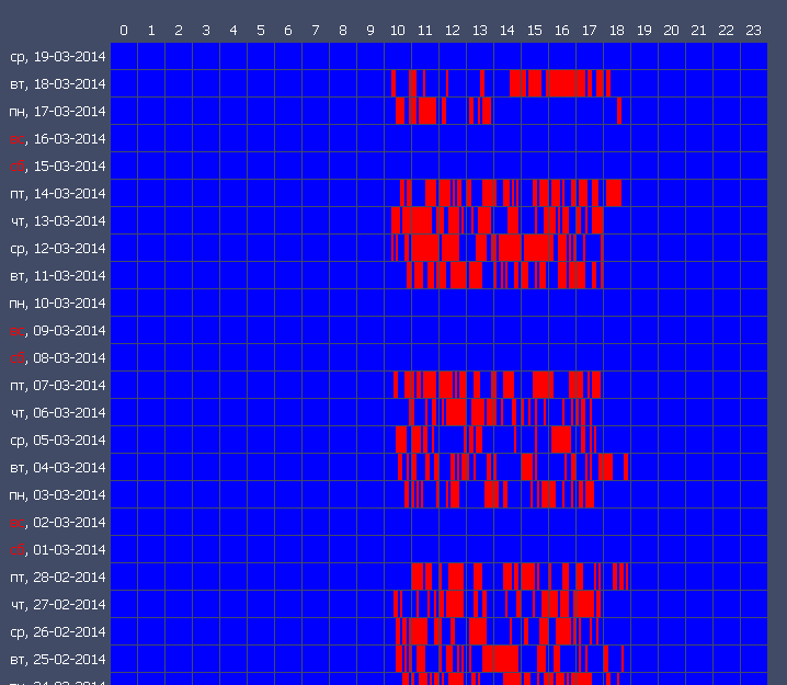 К примеру, на первом графике видно, что у сотрудника рабочий день начинается с 9:00, а заканчивается в 17:00, сотрудник почти всегда приходит вовремя, а если опаздывает, то не на долго, а уходит тоже всегда вовремя, кроме 7 марта. На следующем графике гораздо больше пробелов и время прихода на работу плавающее. Ну а на последнем графике для сравнения приведен режим работы домашнего компьютера.