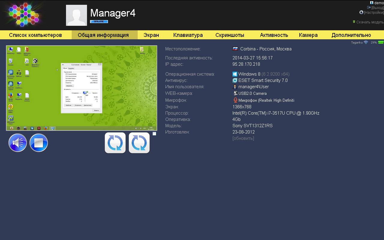 | В отличие от большинства подобных "Ревизору" программ, есть возможность полноценного удаленного мониторинга. Даже если компьютер находится в другом городе, или стране, к нему все равно будет доступ. |